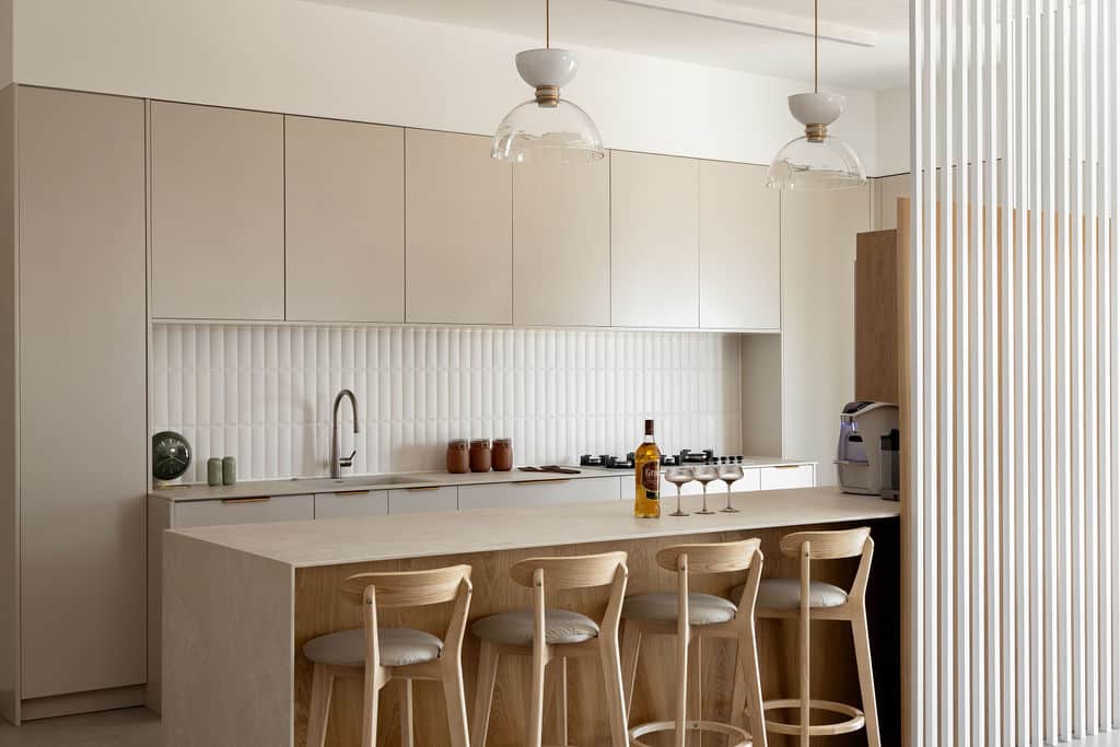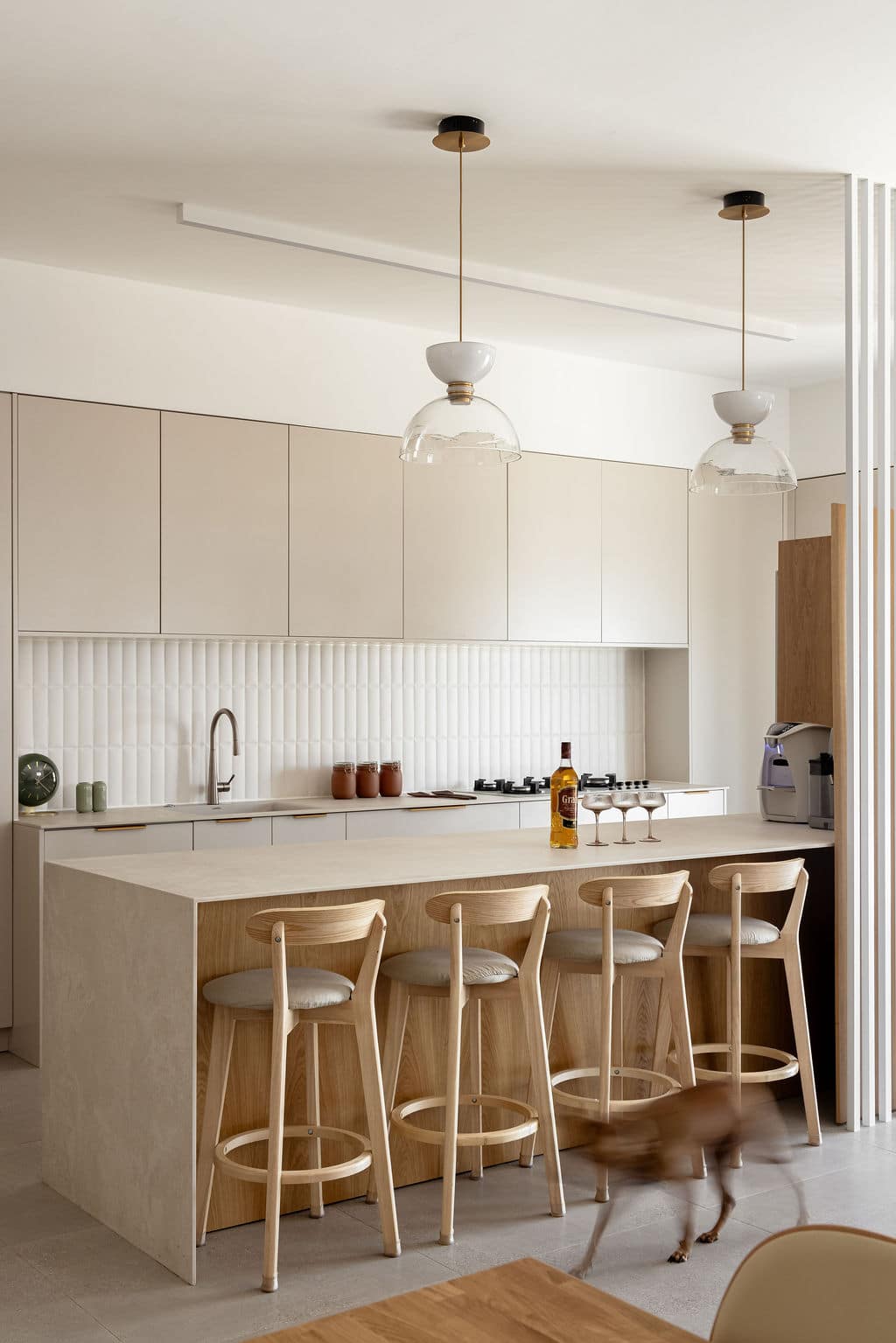אחת מהמשימות המרכזיות בפרויקט הייתה תכנון מוקפד של פתרונות אחסון חכמים, כולל טיפול באתגר לא פשוט: מיקום המקרר במרכז החלל הציבורי. פתרנו זאת באמצעות נגרות מותאמת אישית שמטשטשת את הנוכחות שלו ומשתלבת בהרמוניה עם המטבח והחלל הכללי.